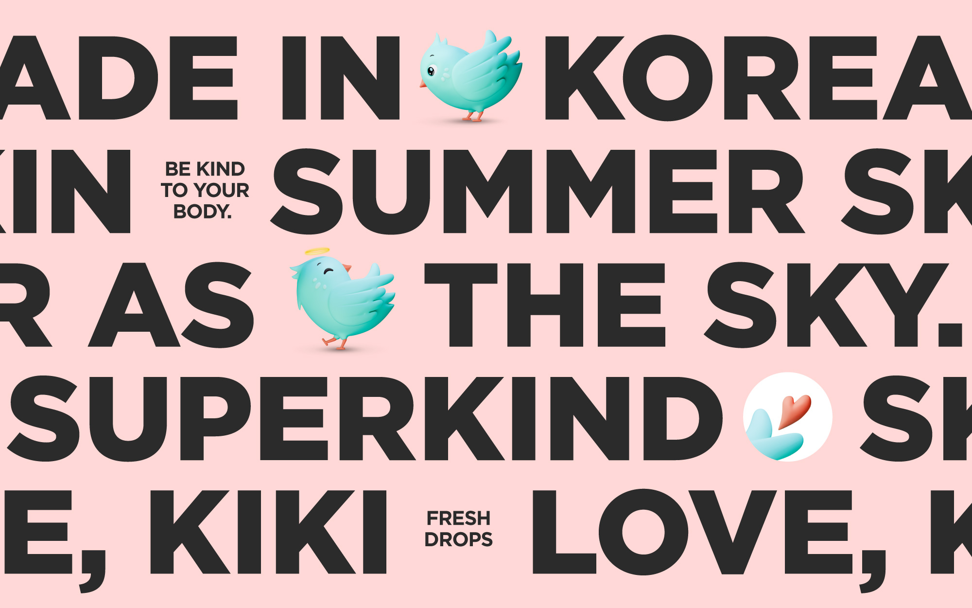 以粉色/桃色为背景主色调,搭配高对比度黑色或白色文字,既凸显Kiki的活泼感,又保持专业零售平台的调性。辅助色系预留扩展空间,适配节日营销或联名活动。