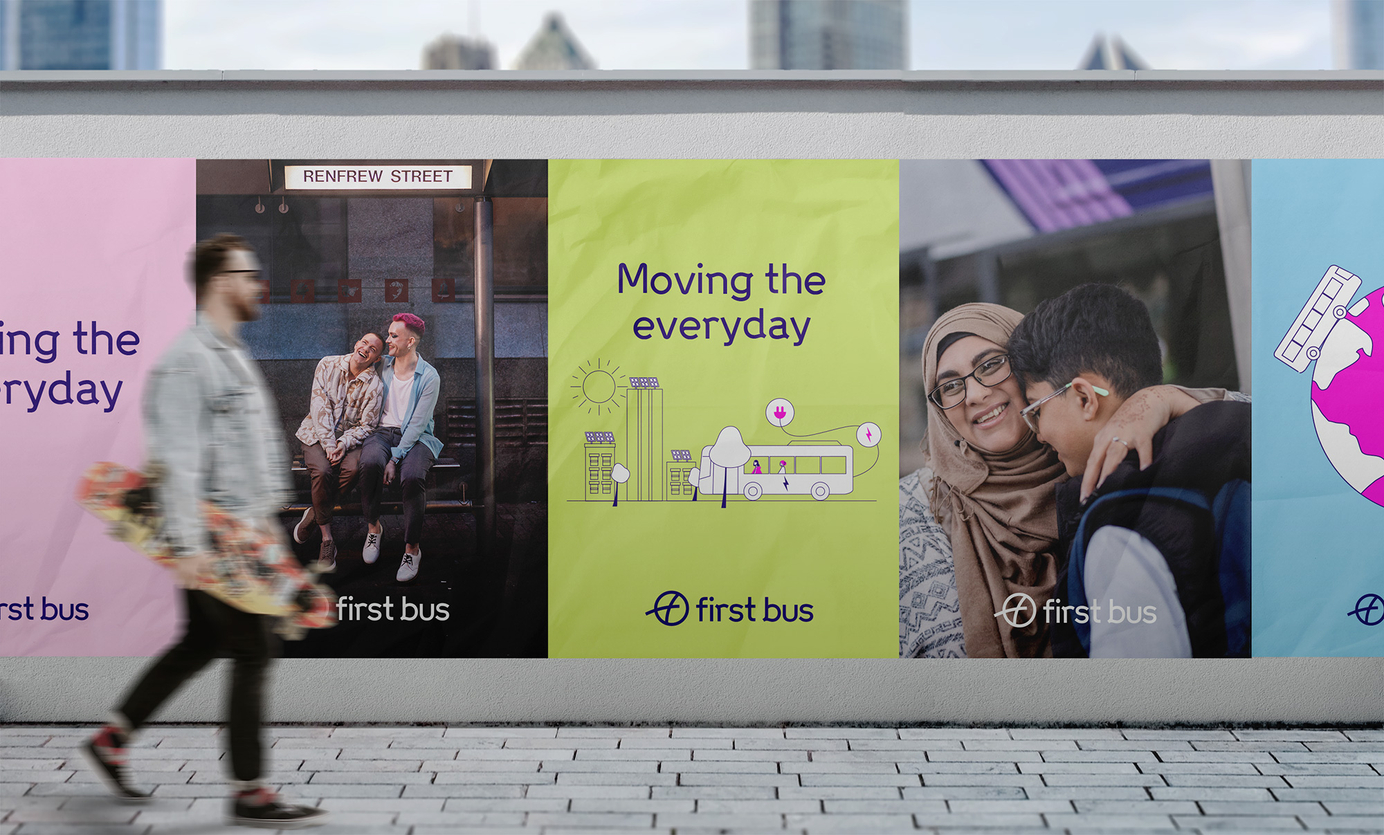 MadeBrave设计公司(位于苏格兰格拉斯哥)承担了此次First Bus的品牌重塑任务。设计团队深入调研后发现,尽管公众对公交品牌普遍持冷漠态度,但对公交车本身却充满深厚情感。因此,设计团队决定以“moving the everyday”为核心平台,通过展现日常生活中的美好、幽默与魔力,来重塑First Bus的品牌形象。这一理念不仅体现了公交服务的普遍性和日常性,也强调了公交在连接人与人、推动社会进步中的重要作用。