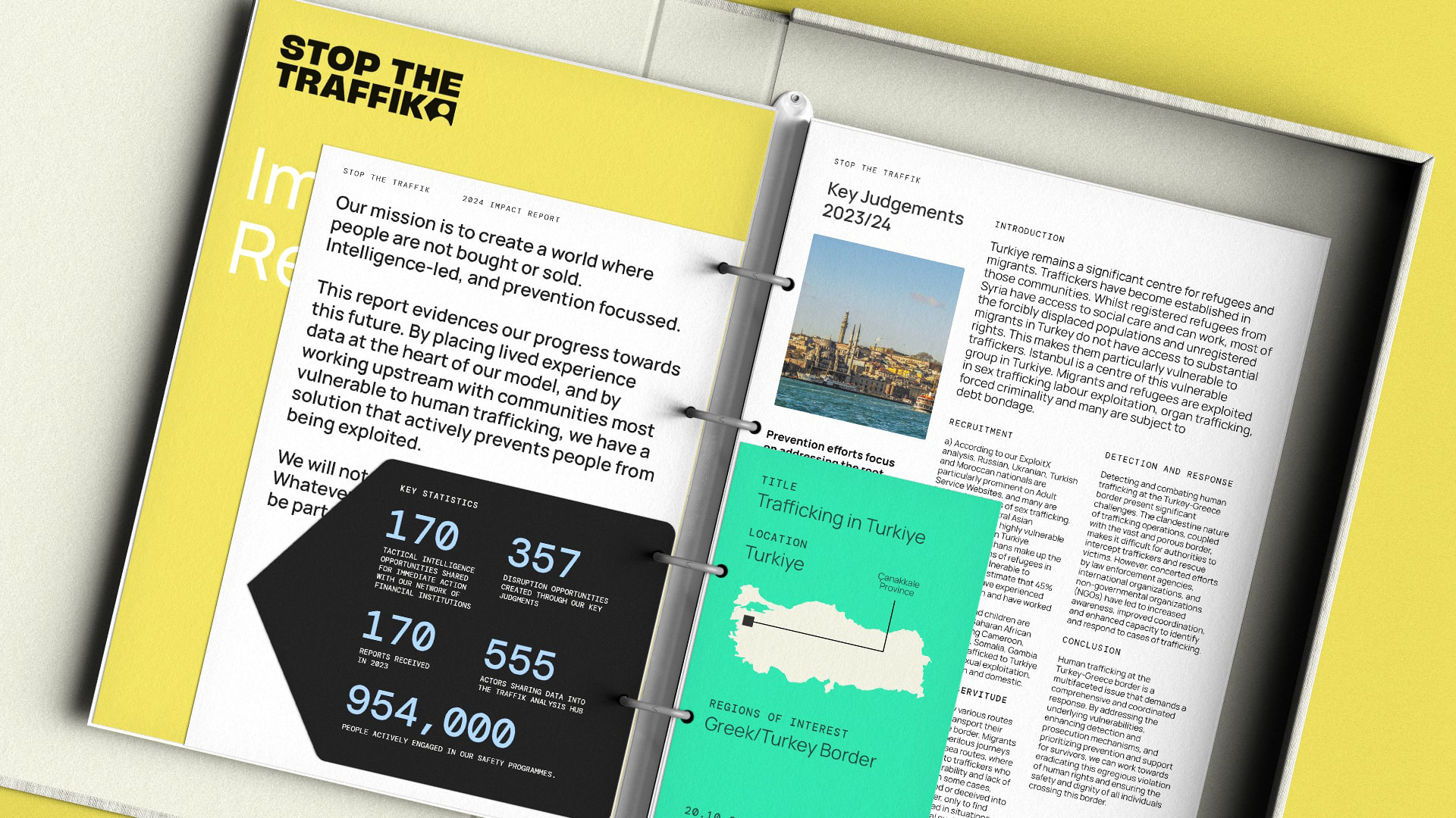 在这样的背景下,Fold7Design(伦敦,英国)为“STOP THE TRAFFIK”设计了新的品牌形象。新设计的核心理念是找到一个醒目且具有普遍象征意义的品牌标识,该标识能够体现组织的核心使命:在贩运发生之前进行预防,并能够适应其众多的项目、合作伙伴、活动和产品。于是,“Stop Arrow”应运而生,这个标识以向后指的箭头为特色,与传统的向上或向前指的箭头形成鲜明对比,强调“之前”而非“之后”,从而传达出预防的重要性。新标识取代了原有的苦难手印符号,中心是一个头像,既表明人在组织所做的一切中的核心地位,也暗示了他们更为现代、数据驱动的处理问题方式。新符号还结合了一套沉浸式的视觉工具,包括子品牌系统、现代字体、更新的色彩搭配以及以人为本的拼贴画风格插图,使组织能够以独特的方式处理即使是最复杂或敏感的主题。